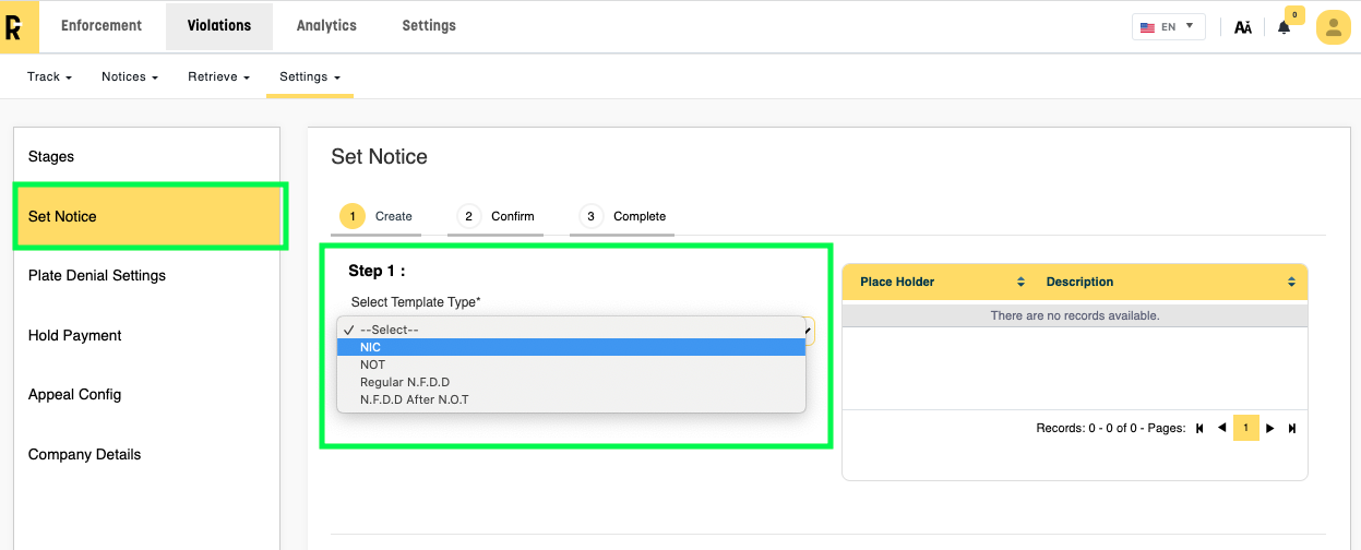 Step 4: Once you have been redirected to the general settings page, select "set notice" on the left side, and under step 1, select the template you are updating (Highlighted in GREEN):