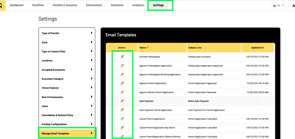 Step 2: Select the "Settings" tab on the horizontal toolbar, and on the left side a vertical toolbar will appear. Select "Manage e-mail templates". Once the page has loaded, under "action" you can select the pencil icon to edit specific e-mail templates (highlighted below in GREEN):